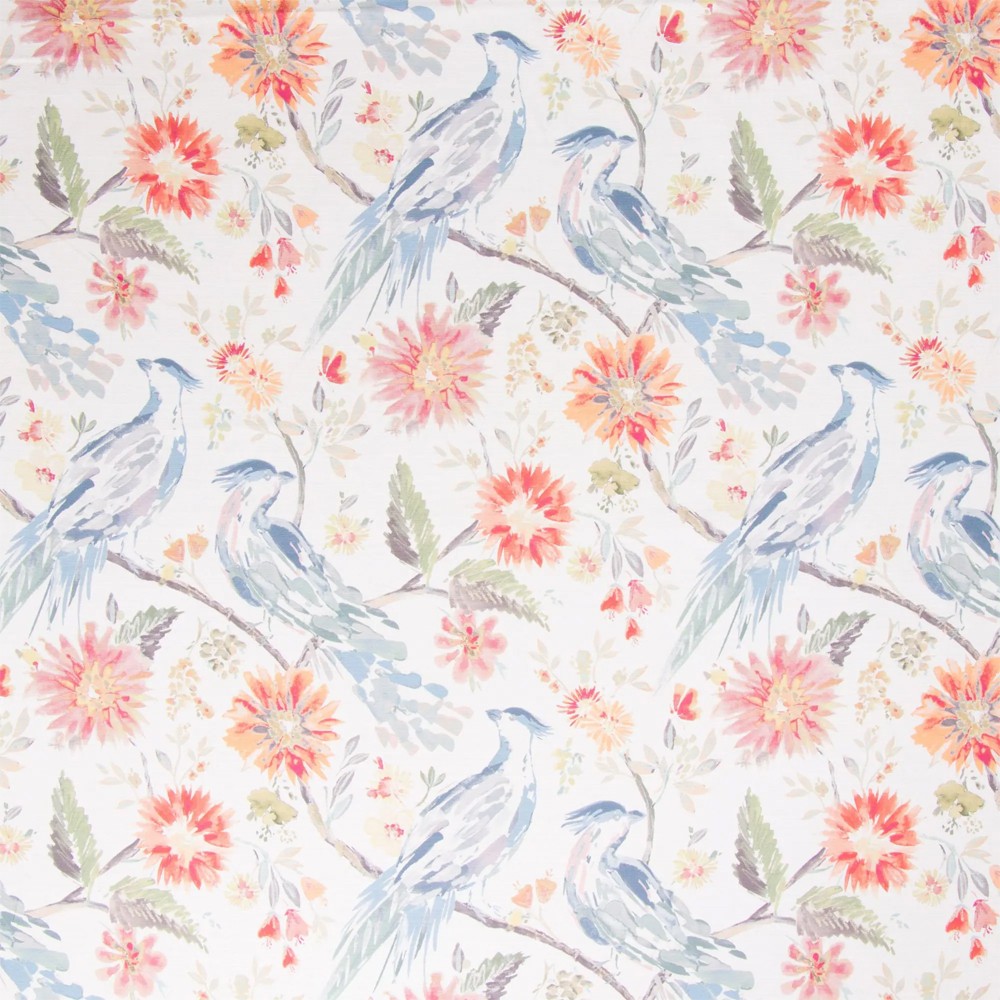 Watercolor floral featuring birds. Pattern runs up the roll. Soil and stain repellent finish.