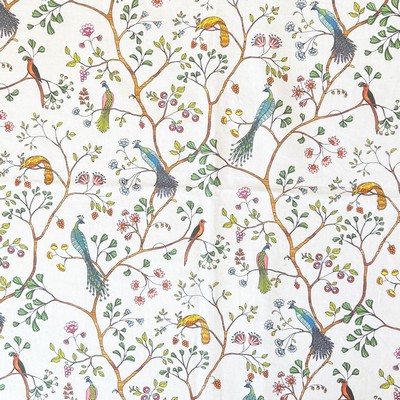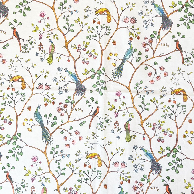 | Charming peacocks and other refined birds perch playfully among scrolling floral branches, adding a whimsical touch to a lively cotton fabric print. |