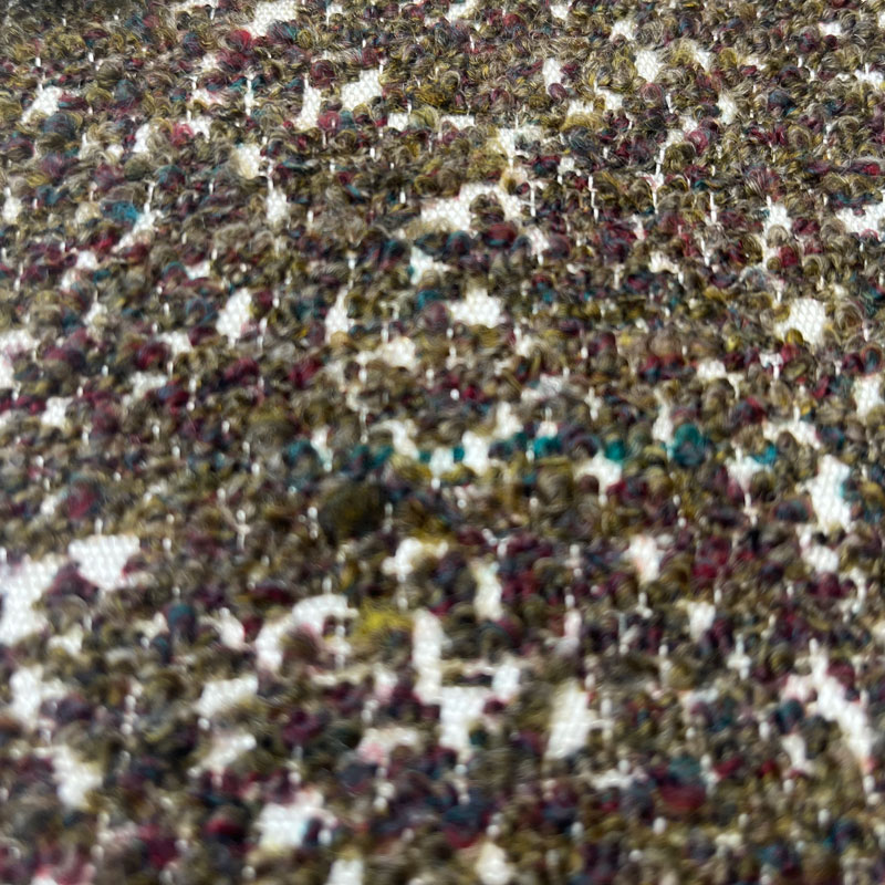 Shades of green/brown with sprinkles of red yello and teal performance upholstery fabric.