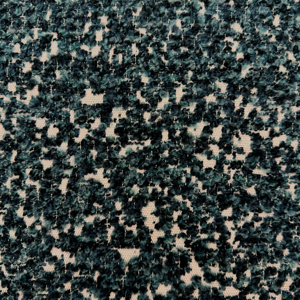 | Shades of navy and teal on a white ground performance upholstery fabric. Soil and stain resistant boucle style upholstery texture. |