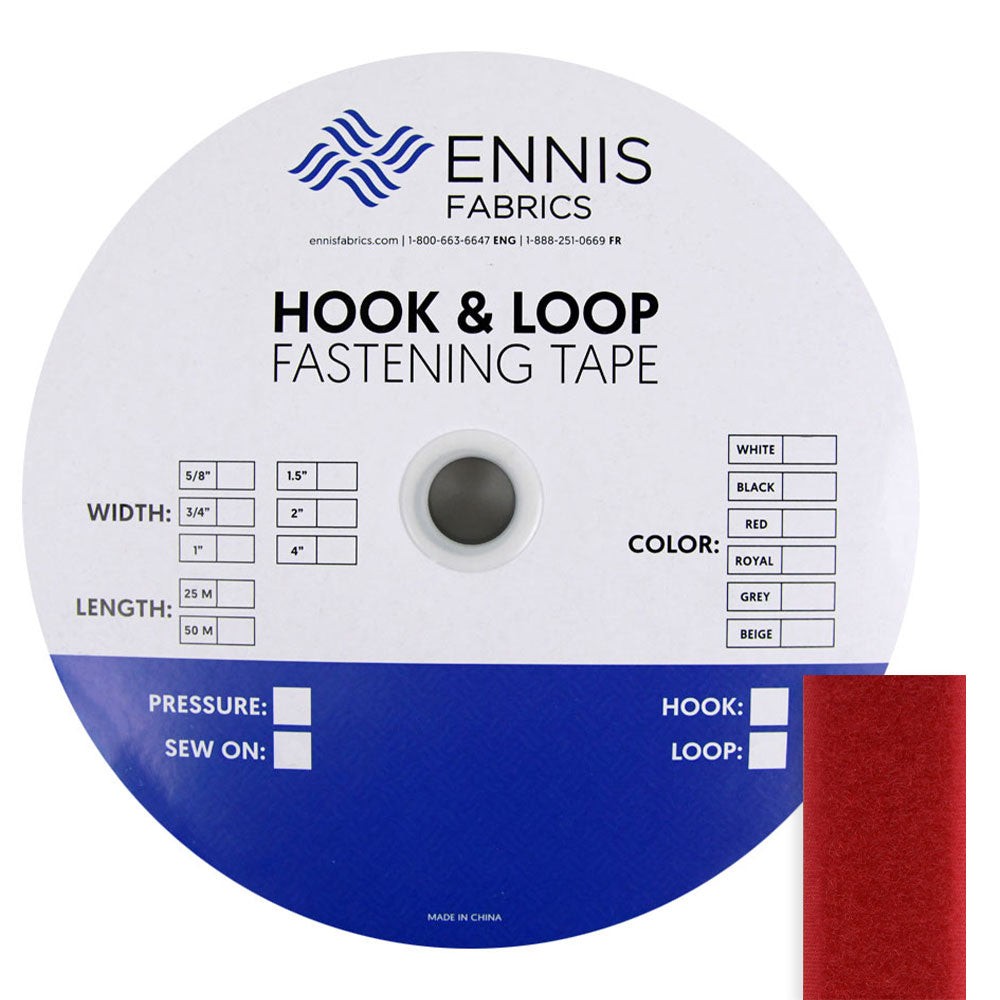 | 1 RL Red Nylon fastener that is a two part system. One part consists of rows of hooks and the part of a mass of loops. When pressed together, they form a highly secure closure, yet can be easily re-opened with a simple peeling action., Completely washable an Upholstery Loop |