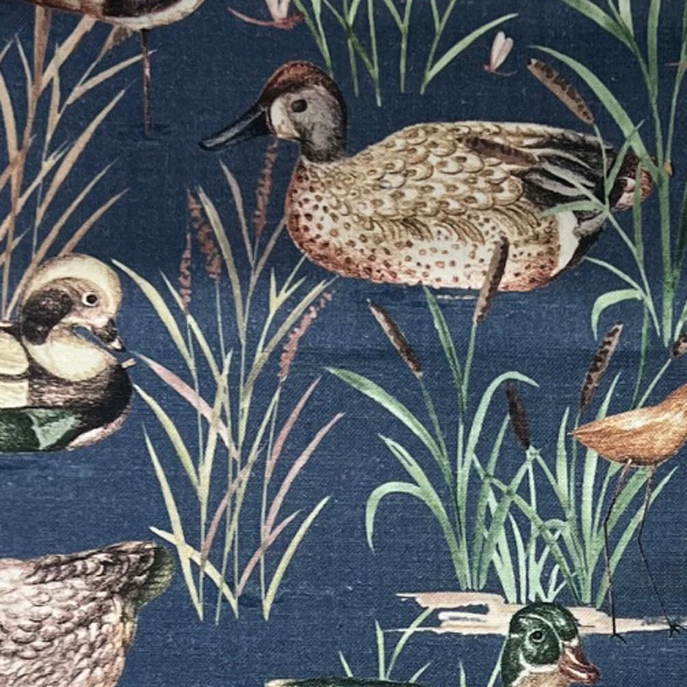 | A playful hunting-themed design featuring mallards and other ducks nestled among reeds. Duck Decoy: This crisp cotton print is a hunter’s delight, perfect for cabin décor, quilts, and outdoor-inspired projects. |