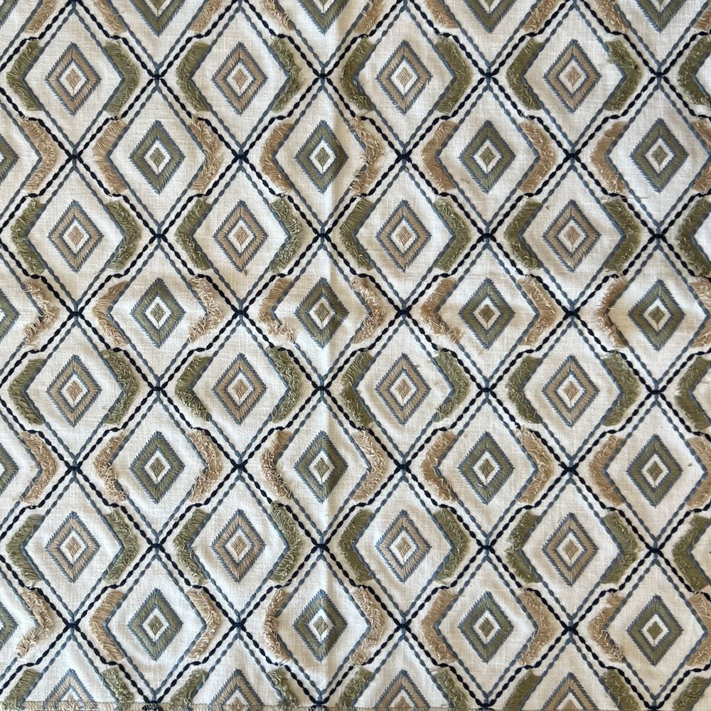 Diamond Embroidered Fabric with Fringed Edging – Gorgeous geometric embroidery in beige and soft blue and green tones dances across a light cream ground. Finished with delicate fringe, this textile adds artisan charm to upholstery, drapery, or decorative accents.
