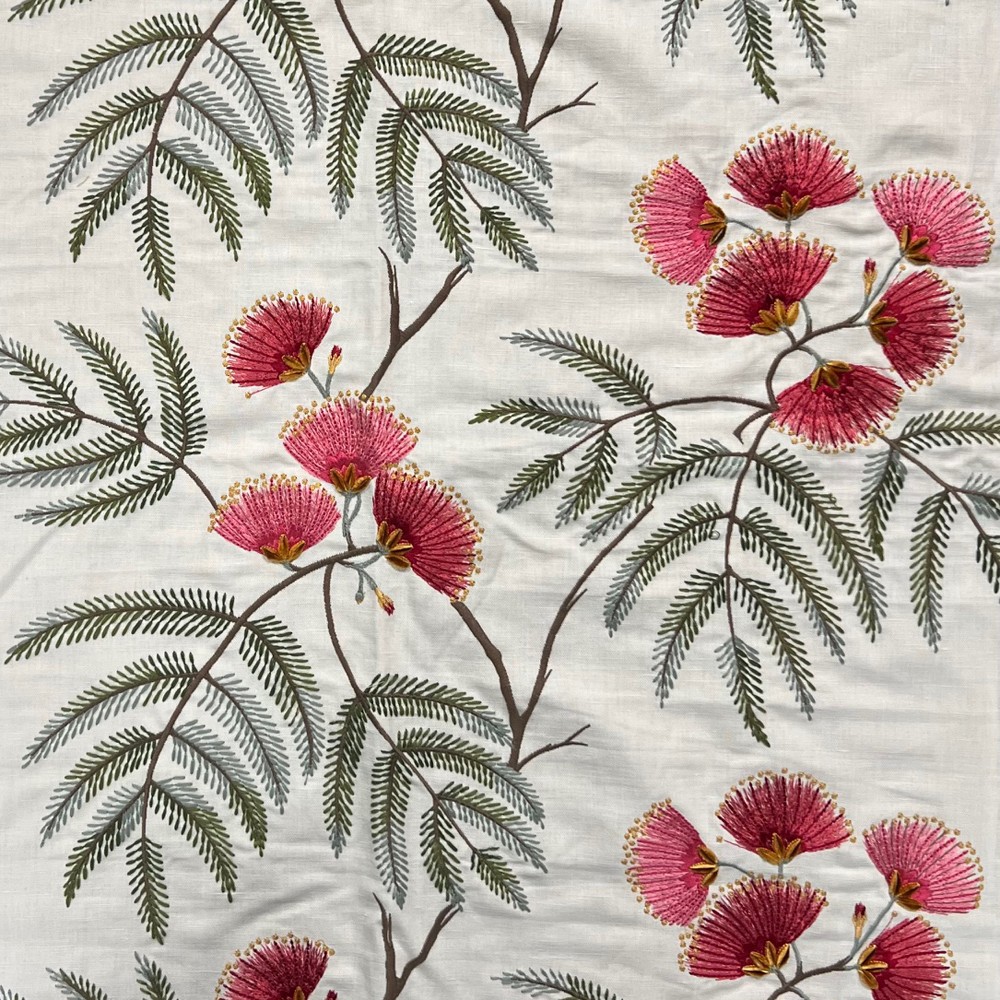 Delicate mimosa blossoms and branches stitched in graceful detail. A lovely choice for upholstery, drapery, or decorative accents that evoke natural charm and artisan beauty.