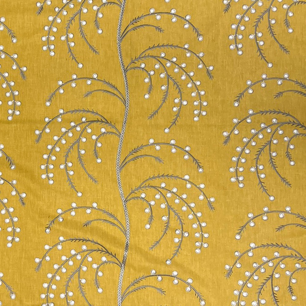 Deepa from TFA Fabrics, a division of Swavelle, showcases a scrolling vertical design embroidered with simple round dots and delicate leaf-like lines. Elegant and versatile, this fabric is perfect for drapery, upholstery, and decorative accents, adding subtle texture and refined detail to any interior space. |