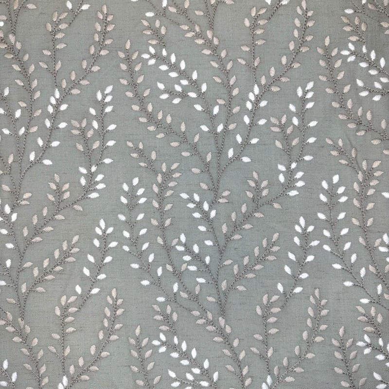 | Lovely embroidered linen look with scrolling leafy vines. Perfect for drapery and bedding. Green ground with white and beige. |