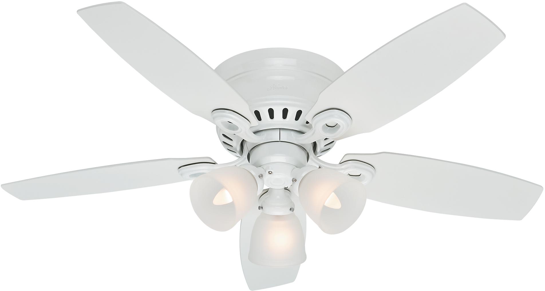 | Casual style with a low profile ceiling fan. Five Snow White Blades WhisperWind™ Motor 3 60W Candelabra Incandescent bulbs included Can be installed without light kit Limited lifetime manufacturer warranty Dust Armor™ blade coating repels dust build-up Airflow: 3422 cfm Electricity Use: 64 w Airflow Effiency: 53 cfm/w Total Height: 14.66" - without light kit: 8.80" Blade pitch: 13° Amps High: 0.516 RPM High: 167 |