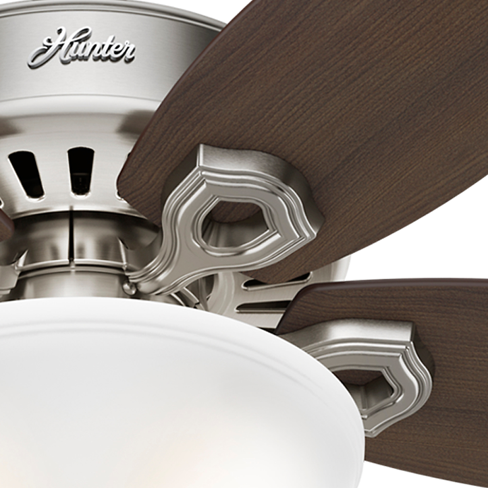 | Hunter Release Date: May 2016 5 Brazilian Cherry / Harvest Mahogany Reversible blades included with this best-selling ceiling fan style. Bowl light kit in cased white glass is included but optional. WhisperWind® motor Standard, flush or angled mounting. Pull Chain Limited Lifetime Motor Warranty Reversible motor for winter/summer 13 degree blade pitch Airflow: 3659 CFM Electricity Use: 62 Watts Airflow Efficiency: 59 CFM/Watt |