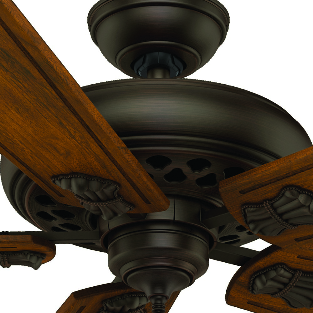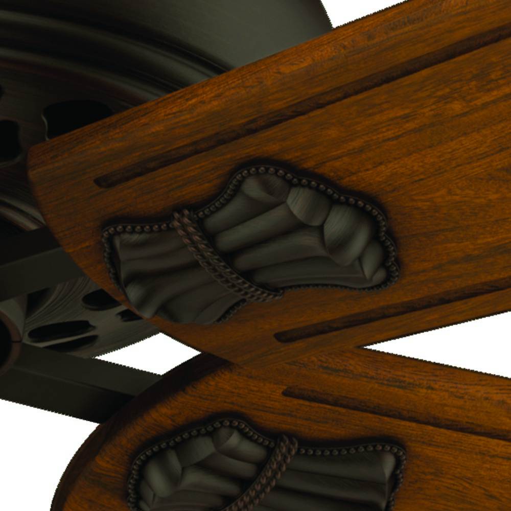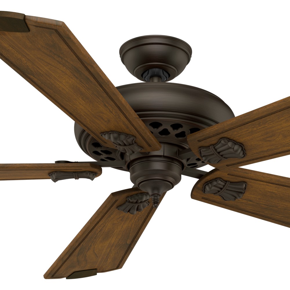| Casablanca Ceiling Fan 60 inch Blade Span This beautiful fan includes 5 Walnut Carved Wood exclusive fan blades. Classic styling with intricate detailing give this ceiling fan the look you want backed by the Casablanca name. Direct Drive™ motor provides unparalleled power, silent performance, and reliability over decades of daily use. Comprehensive Warranty includes a lifetime motor warranty, one-year parts and electronics warranty, and 120-day in-home service. Includes New Universal Wall Control Designed with a 13 degree blade pitch to optimize ideal air movement and best performance. 3" and 2" downrods included to ensure proper distance from the ceiling and optimize air movement at your preferred blade height ENERGY STAR® certified motor. Energy Efficiency at High Speed Airflow 6351 cfm Electricity Use 87 watts Airflow Efficiency 73 cfm/watt Reversible motor allows you to change the direction of your fan from downdraft mode during the summer to updraft mode during the winter. |