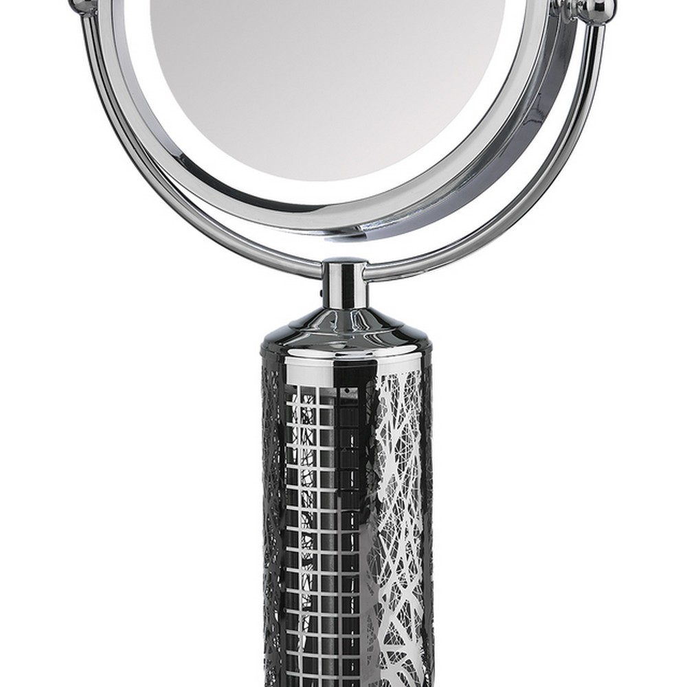 | Keep cool with this lovely multipurpose fan and mirror combination. The LED Lighted Vanity Mirror features a dual-sided, premium quality mirror with two magnifications. See up close with the 10x magnification mirror. The other side features a normal, 1x magnification mirror that is great for checking hair and make-up. 2 Speed Motor 2 Speed Tower Fan, LED Light, 360 Mirror Swivel, 100,000 hour light, 5X and 1X mirror magnification High quality cast metal construction 3 year limited manufacturer warranty Figurine Fans Table Fans |