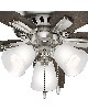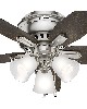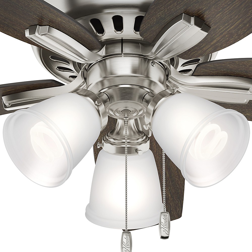 | Casual Ceiling Fan. For indoor use only. 5 Reversible Medium Walnut/Dark Walnut Fan Blades Included. 12 Blade Pitch Light kit features Cased White 3 Light fixture. Includes 3 9W Std. Med. Base CFL Bulbs. 3 speeds controlled by pull chain. Low profile ceiling fan mounts flush to the ceiling. Limited Lifetime Motor Warranty is backed by the only company with over 125 years in the fan business WhisperWind® motor delivers ultra-powerful air movement with whisper-quiet performance so you get the cooling power you want without the noise you don't Reversible motor allows you to change the direction of your fan for the seasons. Overall Height: 0 in Blade Span: 42" Small Room |
