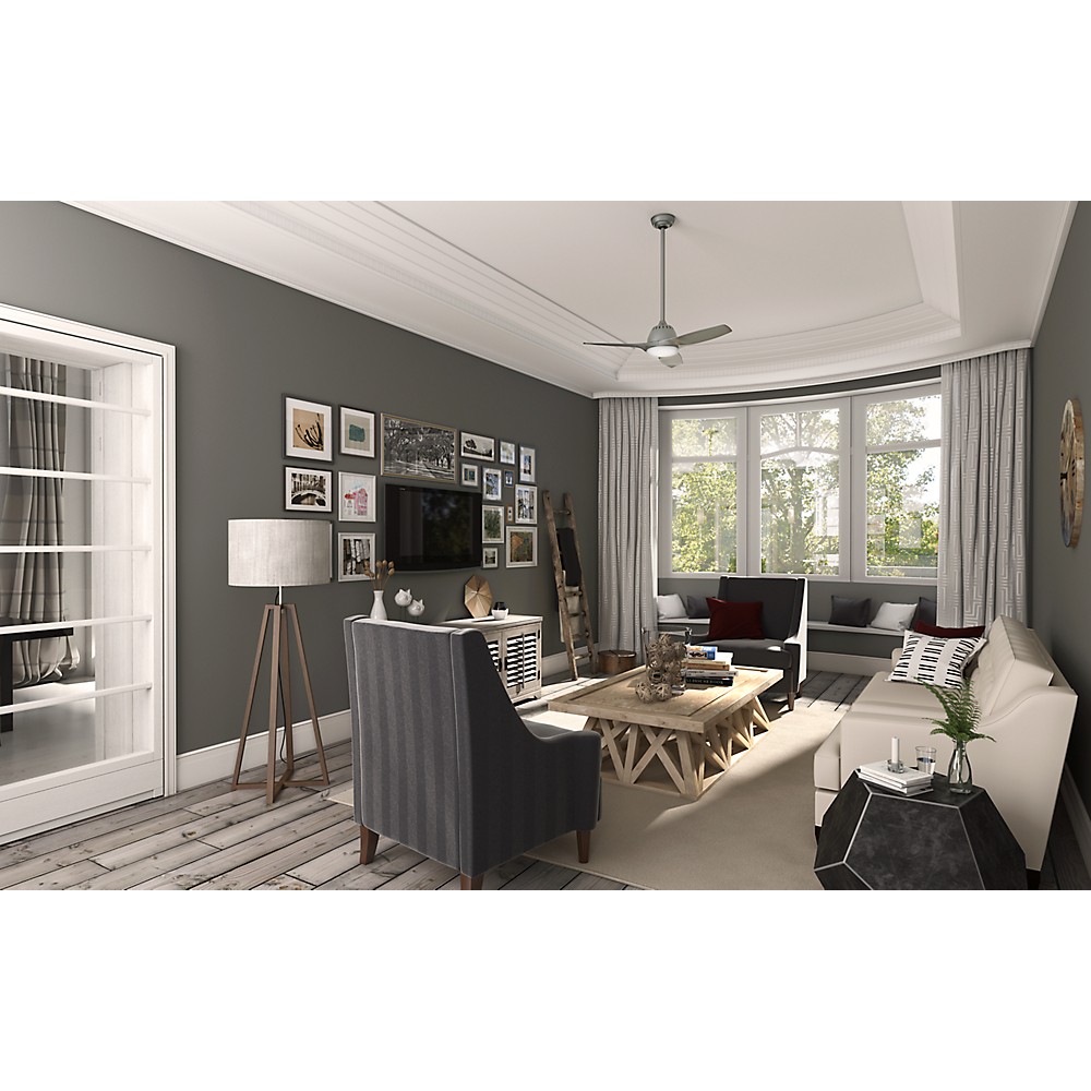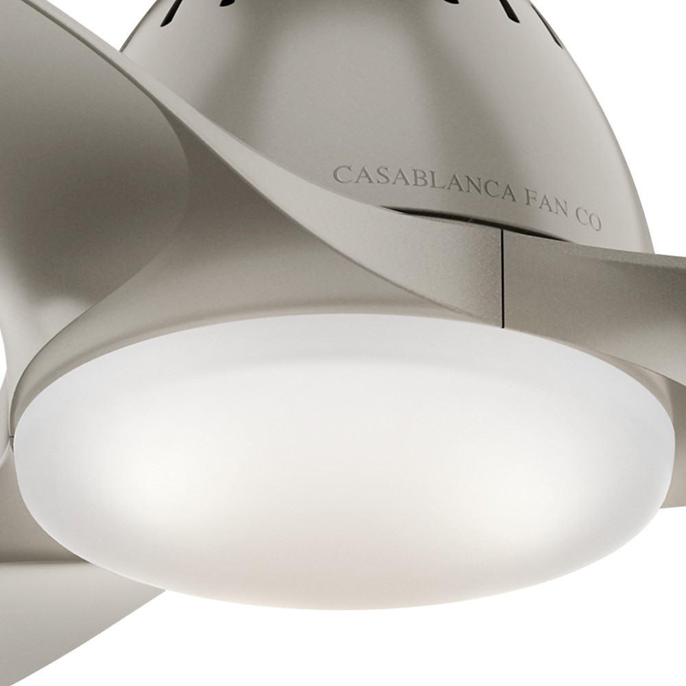 | Contemporary Ceiling Fan. For indoor use only. 3 Pewter Fan Blades Included. 16 Blade Pitch. Light kit features Cased White Integrated fixture. Includes 1 18W LED Bulbs. You will love the dimmable light feature. 4 speeds controlled by Handheld Remote. Three-position mounting system allows installation for angled, flush or standard with the included 2" and 3" downrods. Casablanca's Comprehensive Warranty includes a lifetime motor warranty, one-year parts and electronics warranty, and 120-day in-home service Direct Drive™ motor provides unparalleled power, silent performance, and reliability over decades of daily use Reversible motor allows you to change the direction of your fan for the seasons. Overall Height: 12.08 in Airflow: 4527 CFM Electricity Use: 60.8 WATTS Airflow Efficeincy: 74.46 CFM/WATT Blade Span: 44" Small Room |