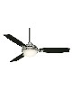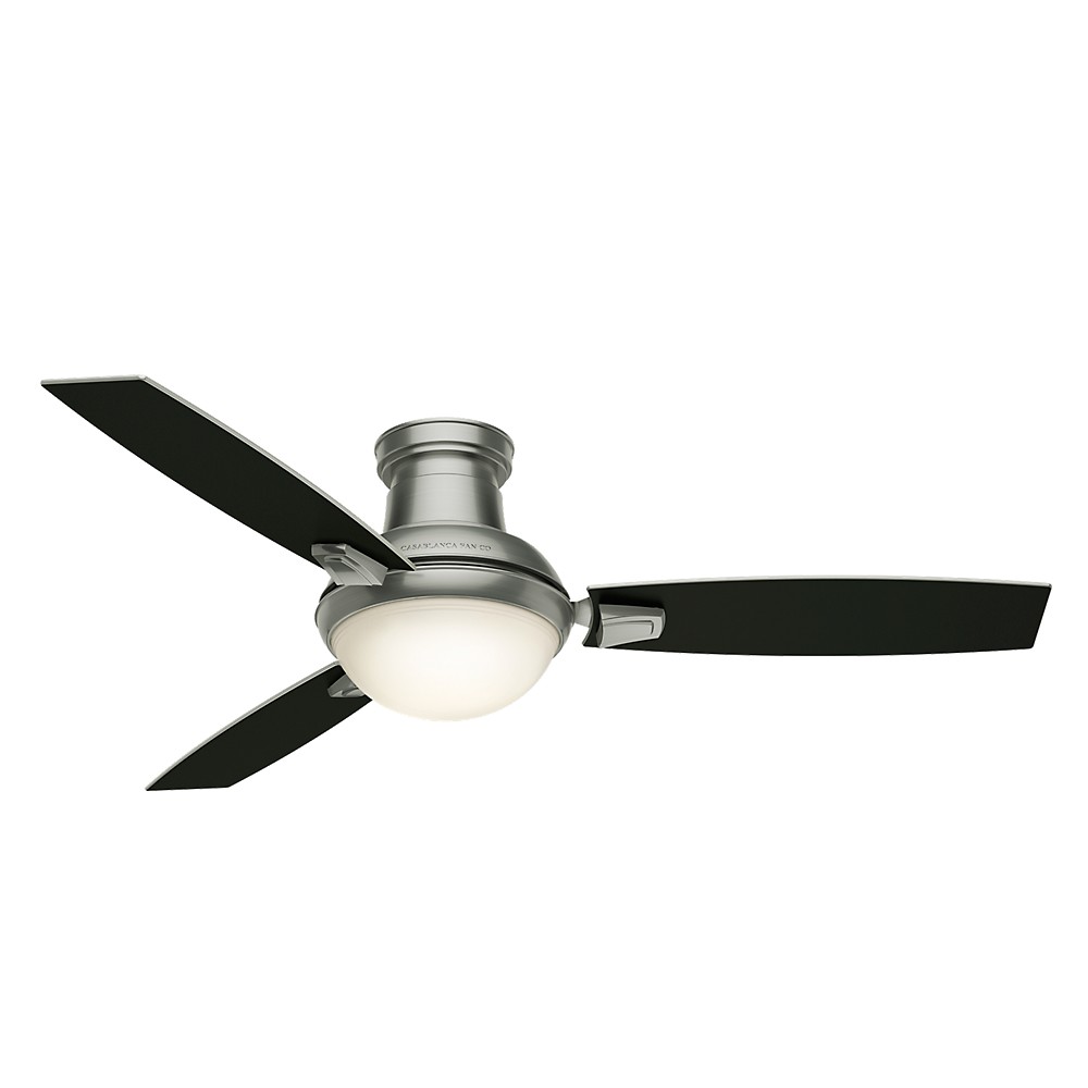 | Contemporary Ceiling Fan. ETL Damp-rated for use in covered porches, patios and sunrooms. 3 Reversible Platinum/Black Mahogany Fan Blades Included. 12 Blade Pitch. Light kit features Cased White Integrated fixture. Includes 1 16W LED Bulbs. You will love the dimmable light feature.Optional no-light cap included 4 speeds controlled by Handheld Remote. Mounting Options: Down Rods Included: 3" Casablanca's Comprehensive Warranty includes a lifetime motor warranty, one-year parts and electronics warranty, and 120-day in-home service Direct Drive™ motor provides unparalleled power, silent performance, and reliability over decades of daily use Reversible motor allows you to change the direction of your fan for the seasons. Overall Height: 10.15 in Airflow: 5987 CFM Electricity Use: 78.2 WATTS Airflow Efficeincy: 76.56 CFM/WATT Blade Span: 54" Large Room |