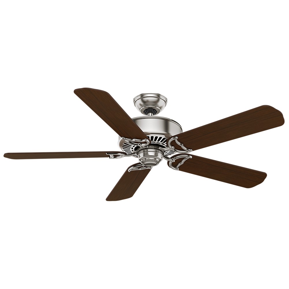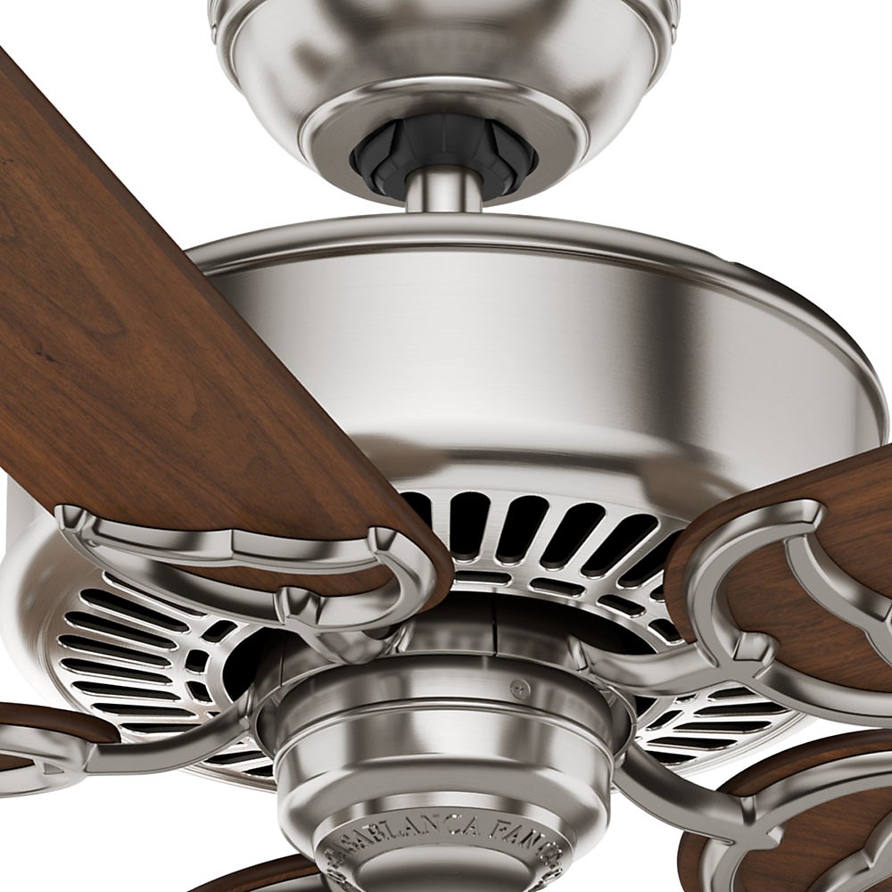 | Traditional Ceiling Fan. For indoor use only. 5 Reversible Walnut/Burnt Walnut Fan Blades Included. 13 Blade Pitch. 4 speeds controlled by Wall Control. Mounting Options: Down Rods Included: " Casablanca's Comprehensive Warranty includes a lifetime motor warranty, one-year parts and electronics warranty, and 120-day in-home service Offering a lifetime of superior performance and silent operation, ultra-powerful DC motor is four to five times more efficient than typical fan motors Reversible motor allows you to change the direction of your fan for the seasons. Overall Height: 11.69 in Airflow: 6674.52 CFM Electricity Use: 32.4 WATTS Airflow Efficeincy: 206 CFM/WATT Blade Span: 54" Large Room |