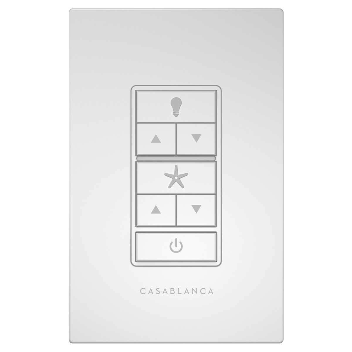 | The Casablanca Wall Control provides four fan speeds and full-range light dimming. With simple arrow buttons to control the fan and light the wall control also features a snap on cover to hide exposed screws for a clean seamless look. *For use with pull chain fans Casablanca Universal Receiver 99199 required (sold separately). Also compatible with new or existing Casablanca fans with controls. |