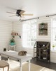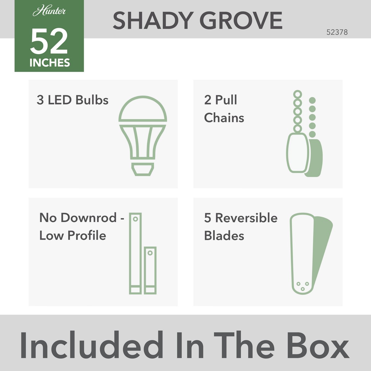 | Add some contemporary style to your bedroom with the Shady Grove ceiling fan. The casual transitional style features blades and a light kit in multiple finishes. An energy-efficient LED bulb included in the three lights can be installed in any fixture setting. The technology of our reversible 3-speed WhisperWind® motor delivers ultra-powerful air movement with whisper-quiet performance so you get the cooling power you want without the noise you don't™. Farmhouse Casual 5 Golden Maple / Natural Oak reversible blades included Light kit features Clear A15 LED Bulb Clear | KA714-01 Includes 3 4.7W LED Bulbs. You will love the dimmable light feature. 3 speeds controlled by pull chain. Specially designed low-profile housing fits flush to the ceiling making it ideal for use in rooms with low ceilings less than 9' " Limited Lifetime Motor Warranty Reversible 3-speed WhisperWind® motor delivers ultra-powerful air movement with whisper-quiet performance so you get the cooling power you want without the noise you don't® Overall Height: 8.71 in Airflow: 3727 CFM Electricity Use: 52 WATTS Airflow Efficeincy: 59 CFM/WATT |