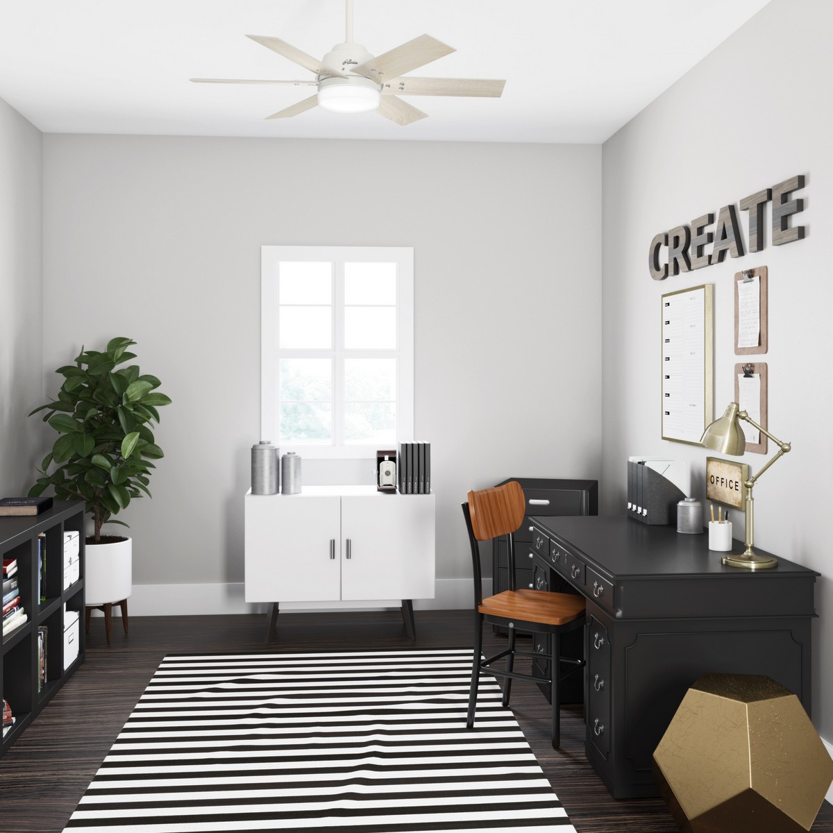 | Small in size but big in cooling power. Built with our SureSpeed® Guarantee the Pacer small room ceiling fan packs a punch and delivers airflow you can feel. The Pacer blends modern design with rustic elements like rivets and rustic wood blade finishes for a look that's at home in a farmhouse or bohemian-style space. Casual Transitional Farmhouse Industrial Boho 6 Light Oak included Light kit features Painted Cased White Inactive|A15 LED Bulb | 800lm Estar | 8 W | K8006-01 Includes 2 8W LED Bulbs. You will love the dimmable light feature. 3 speeds controlled by Handheld Remote. Installer's Choice® three-position mounting system allows for standard low or angled mounting Includes 3'' downrod to ensure proper distance from the ceiling and optimize air movement" Limited Lifetime Motor Warranty Reversible 3-speed WhisperWind® motor delivers ultra-powerful air movement with whisper-quiet performance so you get the cooling power you want without the noise you don't™ Overall Height: 11.05 in Airflow: 4203 CFM Electricity Use: 41 WATTS Airflow Efficeincy: 69 CFM/WATT |