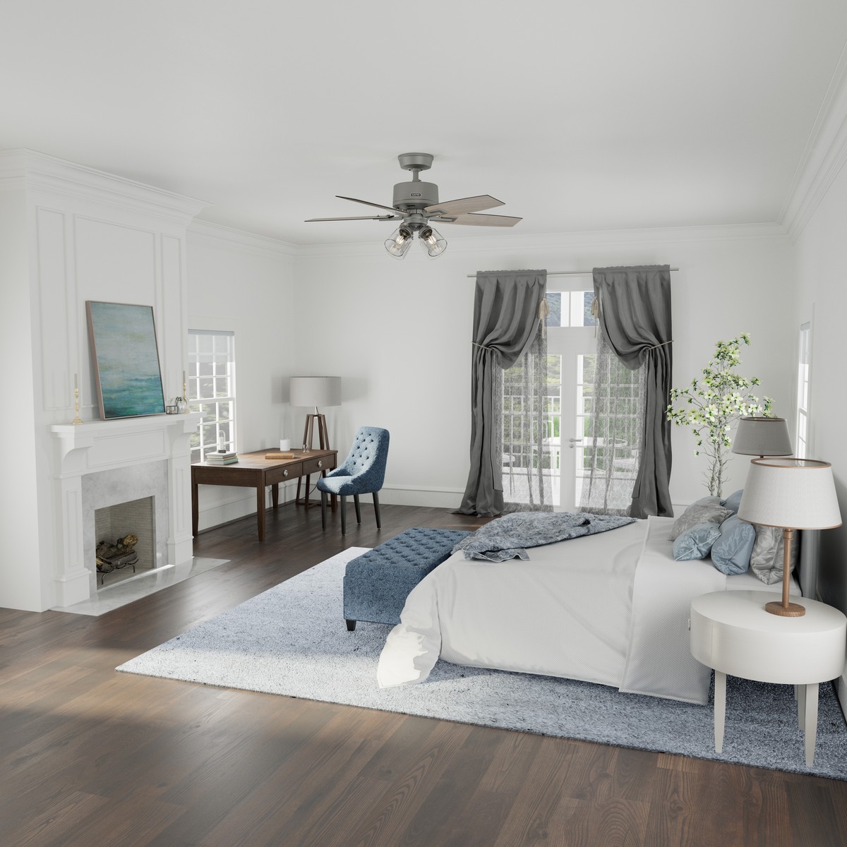 | Captivate your senses with the clean classic lines of this Gatlinburg ceiling fan. The simplistic design matches the soothing look of the multiple finish while seamlessly blending into a variety of decors. Updating your room is a breeze with our HunterExpress® fans making installation as easy as 1-2-3. Great in a bedroom or office it's the perfect match for almost any space. Mix and match with modern lighting from our lighting collections. We have everything you need to finish your rooms with style. Casual Transitional 5 Light Gray Oak blades included Light kit features Clear A15 LED Bulb Clear | KA714-01 Includes 4 4.7W LED Bulbs. You will love the dimmable light feature. 4 speeds controlled by Handheld Remote. Installer's Choice® two-position mounting system allows for standard or angled mounting Includes 3'' downrod to ensure proper distance from the ceiling and optimize air movement" Limited Lifetime Motor Warranty Reversible 4-speed WhisperWind® motor delivers ultra-powerful air movement with whisper-quiet performance so you get the cooling power you want without the noise you don't® Overall Height: 11.72 in Airflow: 4103 CFM Electricity Use: 40 WATTS Airflow Efficeincy: 71 CFM/WATT |
