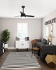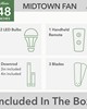 | The Midtown ceiling fan makes itself at home in a variety of spaces. The 48-inch blade span makes it a great fit for many rooms while the design unifies simple and modern styles. The Midtown features our exclusive SureSpeed® Guarantee delivering optimized high-speed cooling. Create the perfect ambiance by using the included handheld remote to easily adjust the dimmable integrated LED light and fan speed. Modern Casual 3 Matte Black blades included Light kit features Painted Cased White A19 DIM Estar Enclosed | Longstar | 9 W | K4870-03 Includes 2 9W LED Bulbs. You will love the dimmable light feature. 3 speeds controlled by Handheld Remote. Installer's Choice® three-position mounting system allows for standard low or angled mounting Includes 4'' downrod to ensure proper distance from the ceiling and optimize air movement" Limited Lifetime Motor Warranty Reversible 3-speed WhisperWind® motor delivers ultra-powerful air movement with whisper-quiet performance so you get the cooling power you want without the noise you don't® Overall Height: 10.79 in Airflow: 4730 CFM Electricity Use: 44 WATTS Airflow Efficeincy: 76 CFM/WATT |