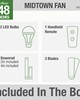 | The Midtown ceiling fan makes itself at home in a variety of spaces. The 48-inch blade span makes it a great fit for many rooms while the design unifies simple and modern styles. The Midtown features our exclusive SureSpeed® Guarantee delivering optimized high-speed cooling. Create the perfect ambiance by using the included handheld remote to easily adjust the dimmable integrated LED light and fan speed. Modern Casual 3 Matte Nickel blades included Light kit features Painted Cased White A19 DIM Estar Enclosed | Longstar | 9 W | K4870-03 Includes 2 9W LED Bulbs. You will love the dimmable light feature. 3 speeds controlled by Handheld Remote. Installer's Choice® three-position mounting system allows for standard low or angled mounting Includes 4'' downrod to ensure proper distance from the ceiling and optimize air movement" Limited Lifetime Motor Warranty Reversible 3-speed WhisperWind® motor delivers ultra-powerful air movement with whisper-quiet performance so you get the cooling power you want without the noise you don't® Overall Height: 10.79 in Airflow: 4730 CFM Electricity Use: 44 WATTS Airflow Efficeincy: 76 CFM/WATT |