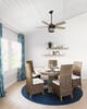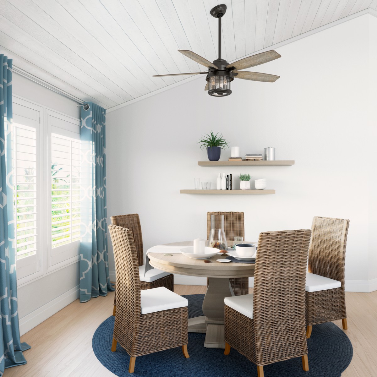 | The Coral Bay chandelier ceiling fan features a lantern-style light fixture with three vintage energy-efficient LED Edison bulbs encased in seeded glass. The Noble Bronze ceiling fan finish will complement your farmhouse decor. This rustic ceiling fan is damp-rated for use in covered porches and patios as well as indoor spaces like living rooms bedrooms and kitchens. The Coral Bay comes with a handheld remote for easy control of the fan speed and direction as well as lighting. Casual Farmhouse 5 Barnwood / Drifted Oak reversible blades included Light kit features Clear Seeded B10 Candelabra Filament | Long Star | 5 W | K7761-01 Includes 3 3.5W LED Bulbs. You will love the dimmable light feature. 3 speeds controlled by Handheld Remote. Installer's Choice® three-position mounting system allows for standard low or angled mounting Includes 3'' downrod to ensure proper distance from the ceiling and optimize air movement" Limited Lifetime Motor Warranty Reversible 3-speed WhisperWind® motor delivers ultra-powerful air movement with whisper-quiet performance so you get the cooling power you want without the noise you don't® Overall Height: 9.93 in Airflow: 5442 CFM Electricity Use: 48 WATTS Airflow Efficeincy: 74 CFM/WATT |