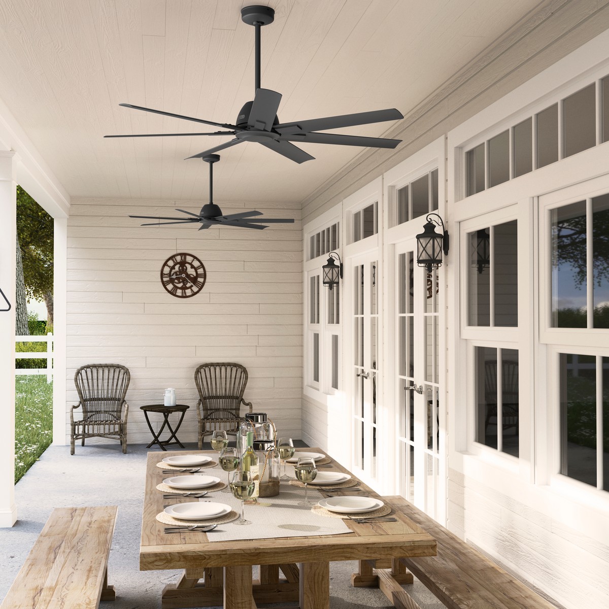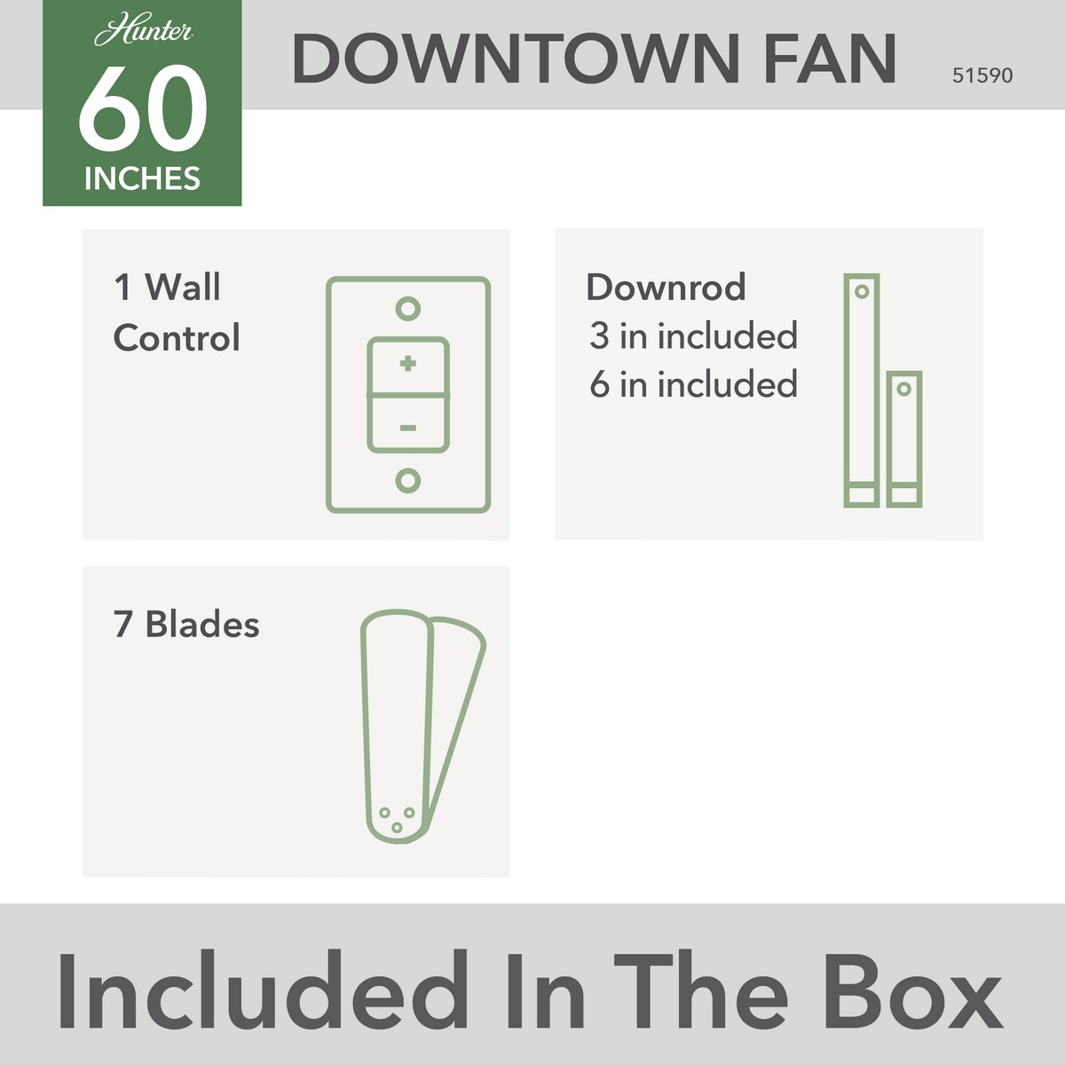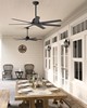 | A must for your patio. The 60-inch Downtown ceiling fan keeps the air moving in both your indoor and outdoor spaces. This modern and industrial fan brings a clean design to large spaces. Featuring our exclusive Surespeed® technology the Downtown Ceiling fan keeps your porches and pergolas stylish and cool. Industrial Modern 7 Matte Black blades included 6 speeds controlled by Wall Control. Installer's Choice® three-position mounting system allows for standard low or angled mounting Includes 6'' downrod to ensure proper distance from the ceiling and optimize air movement" Yes Limited Lifetime Motor Warranty Reversible 6-speed EcoWhisper DC Overall Height: 14.52 in Airflow: 8363 CFM Electricity Use: 17 WATTS Airflow Efficeincy: 323 CFM/WATT |