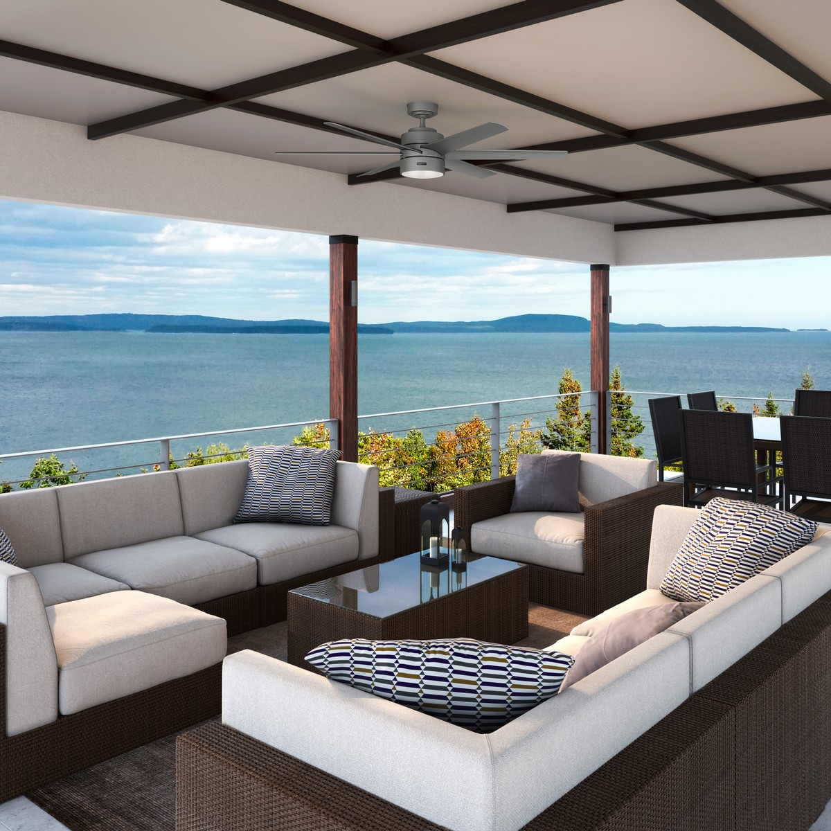 | The Solaria outdoor ceiling fan features our exclusive SureSpeed® Guarantee providing unrivaled high-speed cooling. As a Hunter ENERGY STAR® certified ceiling fan the Solaria is 64% more efficient on average than conventional fans* while helping you save you money on cooling costs. This large ceiling fan is damp-rated for use in covered rooms exposed to moisture like porches patios garages and bathrooms. Casual Industrial Modern 6 Matte Silver blades included Light kit features Painted Cased White Hunter Small (2) Int LED | Foxconn 24 W | K8233-08 Includes 1 24W LED Module Bulbs. You will love the dimmable light feature. 6 speeds controlled by Integrated Control System - Wall Control. Installer's Choice® three-position mounting system allows for standard low or angled mounting Includes 3'' downrod to ensure proper distance from the ceiling and optimize air movement" Yes Limited Lifetime Motor Warranty Reversible 6-speed EcoWhisper DC Overall Height: 10.79 in Airflow: 7307 CFM Electricity Use: 20 WATTS Airflow Efficeincy: 236 CFM/WATT |
