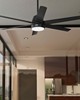 6 Matte Black blades included Light kit features Painted Cased White A19 LED Bulb | DIM EStar | 9 W | K4870-02 Includes 1 9W LED Bulbs. You will love the dimmable light feature. 6 speeds controlled by Integrated Control System - Wall Control. Installer's Choice® three-position mounting system allows for standard low or angled mounting
