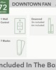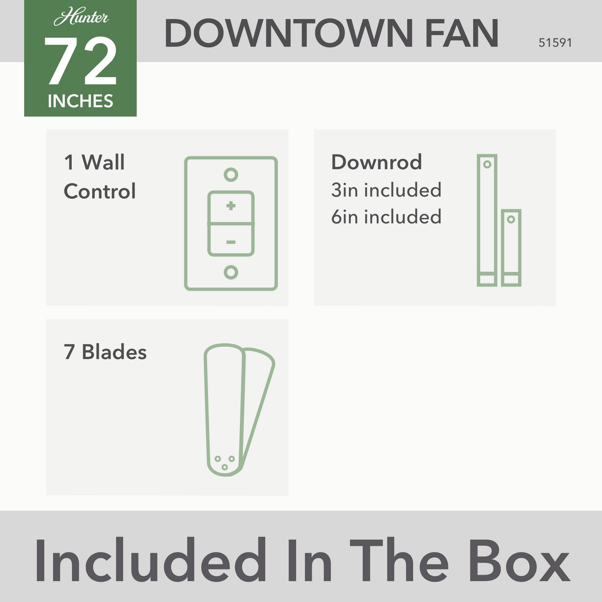 | Create a focal point. With its sleek finishes and spanning blades the 72-inch Downtown ceiling fan commands attention in your large indoor and outdoor spaces. This ceiling fan combines modern and industrial styles to form an unforgettable fixture. Plus its clean design makes it the perfect addition to all your spaces – regardless of their style. Industrial Modern 7 Matte Silver blades included 6 speeds controlled by Wall Control. Installer's Choice® three-position mounting system allows for standard low or angled mounting Includes 3'' downrod to ensure proper distance from the ceiling and optimize air movement" Yes Limited Lifetime Motor Warranty Reversible 6-speed EcoWhisper DC Overall Height: 11.52 in Airflow: 11694 CFM Electricity Use: 27 WATTS Airflow Efficeincy: 290 CFM/WATT |