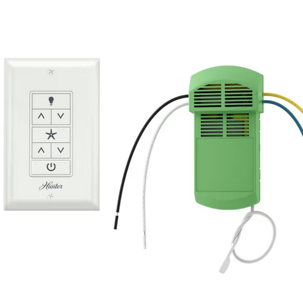 | Hunter's universal ceiling fan wall control is compatible with both Hunter ceiling fans and many other brands. Installation is simpleājust place the included remote receiver inside the fan's canopy, and the wall control comes pre-paired for immediate use. Easily adjust the fan speed and light settings directly from the wall control, which is designed to fit flush against the wall for a sleek, modern appearance. This wall control works with Hunter and Casablanca fans, excluding Hunter OriginalĀ® and DC models. |