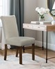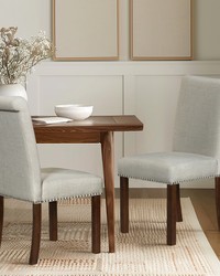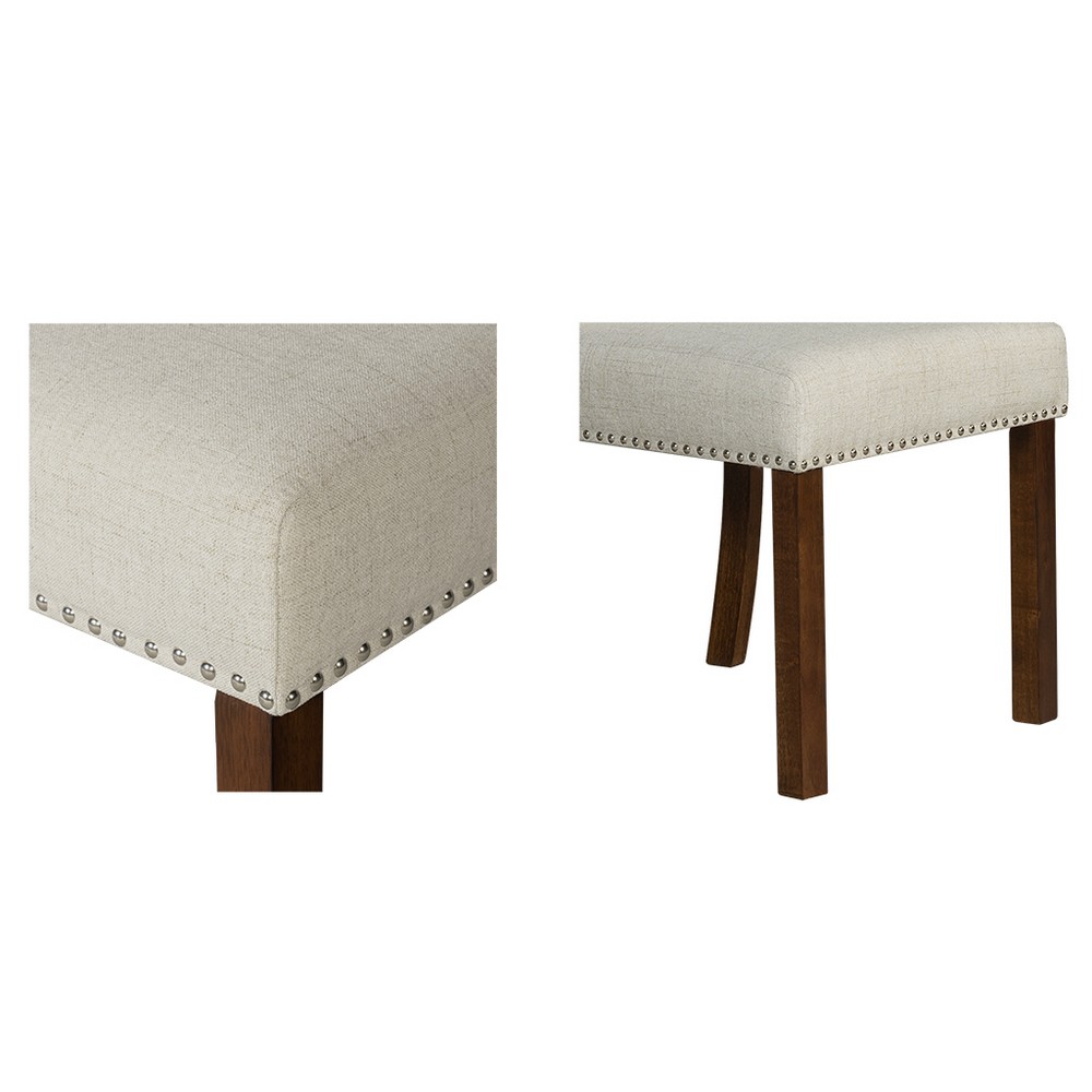 Embrace timeless elegance with the Aubrey Dining Chair Set from 510 Design. These chairs feature a transitional style, showcasing a distinctive roll back design and adorned with silver nailhead trim around the seat. Their armless construction saves space, fitting seamlessly under dining tables. Sink into plush upholstered seat and back for a comfortable dining experience. Crafted with solid wood legs featuring adjustable levelers for stability. Simple assembly required.