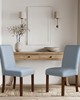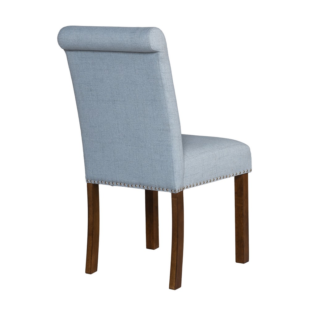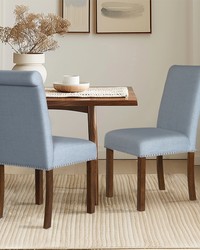| 510 Design See below 2 Dining Chairs: 19.25"W x 24"D x 38"H(2) Seat: 19.25"W x 17.5"D x 20.5"H Leg Height: 14.75"H Back Rest height: 17"W x 17.5"H Weight Capacity: 300lbs Frame Composition: Solid wood and plywood Leg Material: Solid wood Wood Finish: Medium Walnut Metal Finish: Matte silver Fabric Composition: 100% Polyester Seat Construction: Plywood and Foam Cushion or Upholstery Fill Material: Foam Transitional Modern Style Includes 2 Piece(s) • To protect the finish, do not apply abrasive cleaners • Wipe clean with damp cloth • Hardware may loosen over time. Periodically check and re-tighten connections. Embrace timeless elegance with the Aubrey Dining Chair Set from 510 Design. These chairs feature a transitional style, showcasing a distinctive roll back design and adorned with silver nailhead trim around the seat. Their armless construction saves space, fitting seamlessly under dining tables. Sink into plush upholstered seat and back for a comfortable dining experience. Crafted with solid wood legs featuring adjustable levelers for stability. Simple assembly required. |