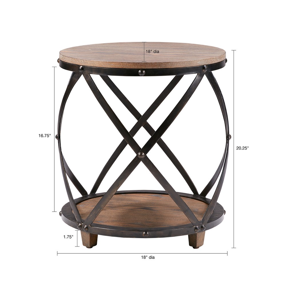 | Madison Park See below 1 Table: DIA 18" x 20.25"H Table Top: 18"W x 18"D x 0.625"T Leg Size: 1.375"W x 1.75"H Distance Between Legs: 9.75" Shelf Distance: 16.75" Material: Ash Veneer, Metal and MDF Wood/Metal Finish: Metal: Antiqued Bronze / Wood: Reclaimed Gray Traditional Style Includes 1 Piece(s) WIPE CLEAN WITH DAMP CLOTH The Cirque Metal Accent Table is a great addition to any room. It's rustic weathered wood finish and antiqued bronze metal finish showcases well any living room collection. It's wood top can display any décor to add a touch of charm to your room. Fully assembled. |