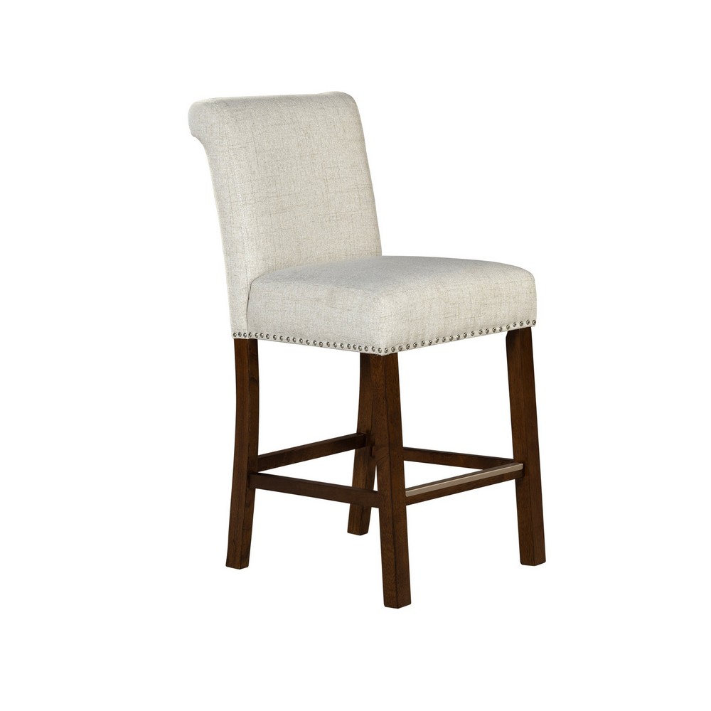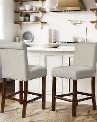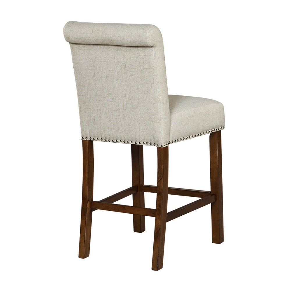 | 510 Design See below 2 Stools: 18.5"W x 22.25"D x 38.5"H (2) Seat: 18.5"W x 16.5"D x 25.75"H Leg Height: 20"H Footrest Height: 8.5"H Back Rest Size: 16"W x 12.75"H Weight Capacity: 300lbs Frame Composition: Solid wood and plywood Leg Material: Solid wood Wood Finish: Medium Walnut Metal Finish: Matte silver Fabric Composition: 100% Polyester Seat Construction: Plywood and Foam Cushion or Upholstery Fill Material: Foam Transitional Modern Style Includes 2 Piece(s) • To protect the finish, do not apply abrasive cleaners. • Wipe clean with damp cloth • Hardware may loosen over time. Periodically check and re-tighten connections. Embrace timeless elegance with the Aubrey Counter Stool Set from 510 Design. These stools feature a transitional style with a distinctive roll back design and silver nailhead trim. Perfect for your kitchen or bar area, they offer plush upholstered seats and backs for comfort. Crafted with a sturdy solid wood frame and a protective metal kick plate, it's designed to withstand daily wear and tear. Simple assembly required. |