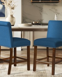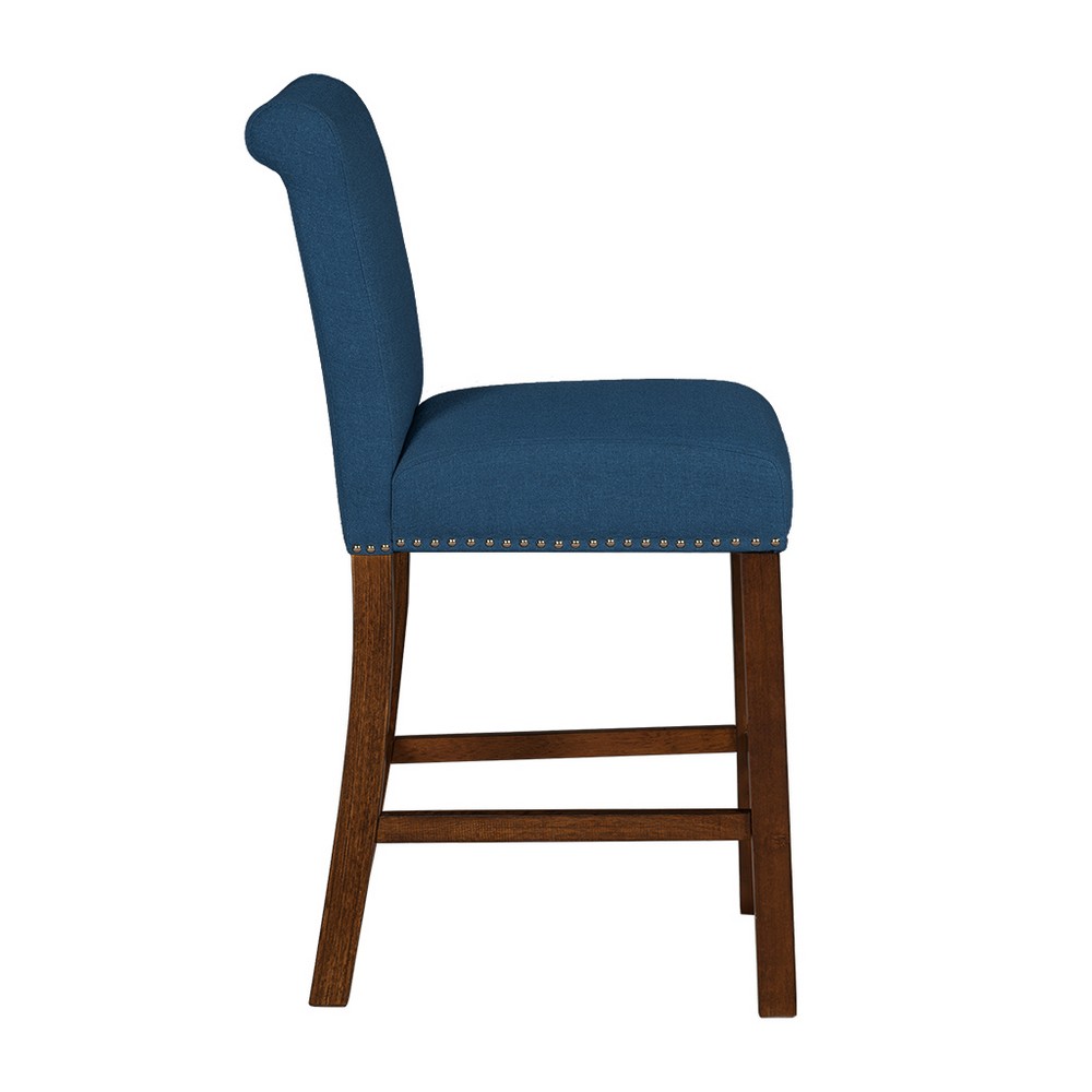 | 510 Design See below 2 Stools: 18.5"W x 22.25"D x 38.5"H (2) Seat: 18.5"W x 16.5"D x 25.75"H Leg Height: 20"H Footrest Height: 8.5"H Back Rest Size: 16"W x 12.75"H Weight Capacity: 300lbs Frame Composition: Solid wood and plywood Leg Material: Solid wood Wood Finish: Medium Walnut Metal Finish: Matte silver Fabric Composition: 100% Polyester Seat Construction: Plywood and Foam Cushion or Upholstery Fill Material: Foam Transitional Modern Style Includes 2 Piece(s) • To protect the finish, do not apply abrasive cleaners. • Wipe clean with damp cloth • Hardware may loosen over time. Periodically check and re-tighten connections. Embrace timeless elegance with the Aubrey Counter Stool Set from 510 Design. These stools feature a transitional style with a distinctive roll back design and silver nailhead trim. Perfect for your kitchen or bar area, they offer plush upholstered seats and backs for comfort. Crafted with a sturdy solid wood frame and a protective metal kick plate, it's designed to withstand daily wear and tear. Simple assembly required. |
