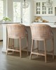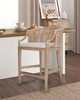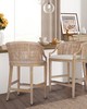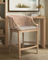 | Martha Stewart See below Overall: 23"W x 22.5"D x 35"H Seat: 20"W x 18.5"D x 25"H Footrest to Floor Height: 8.25"H Back Rest Size: 20"W x 10"H Weight Capacity: 300 lbs Frame Composition: Solid wood and plywood Leg Material: Solid wood Arm Material: Solid wood Back Material: Rattan Fabric Composition: 100% polyester Upholstery Fill Material: Foam Wood Finish: Reclaimed wheat Metal Finish: Antique bronze Rattan Co Transitional Modern Style Includes 1 Piece(s) Spot clean Elevate your home with the Martha Stewart Playa Counter Stool, a perfect blend of style and comfort. Featuring a handwoven rattan back and airy open arms, this stool adds a relaxed, coastal touch to any space. The mixed-material design combines a solid wood frame, soft upholstered seat, and antique bronze metal kick plate for durability and contrast. A gently curved back and built-in footrest ensure ergonomic support. Upholstered in a tightly woven, anti-pill fabric, it offers lasting comfort. Natural variations in wood and rattan make each piece unique. Tool included for assembly. |