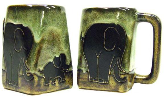 Baby elephant led by her momma on this 12oz square bottom mug.Mara Stoneware