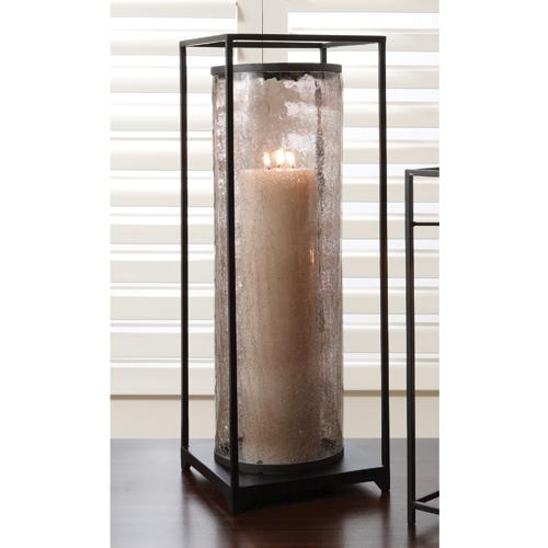 Hand wash Candle Holds a 5"Dia. Pillar Candle Surrounded by a black iron frame, a crackled glass cylinder holds your favorite pillar candle. Our Open Cube Lantern will fill your space with a warm glow when a candle is lit.