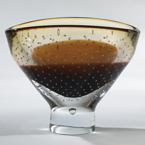 | Unique hand-formed clear Polish art glass bowl with layers of color and bubbles. |