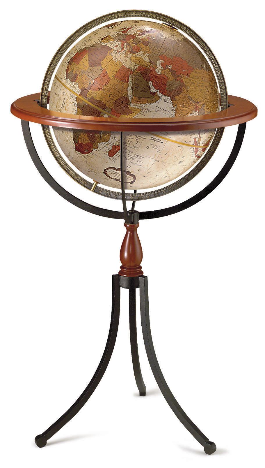 | A visually compelling globe to accompany an elegant stand. A wood ring with cherry finish supported by a wrought-iron stand in matte black make this piece one of a kind. Our final touches include a wood riser with cherry finish and a 16" diameter bronze metallic globe with beautifully blended earth-tone colors. |