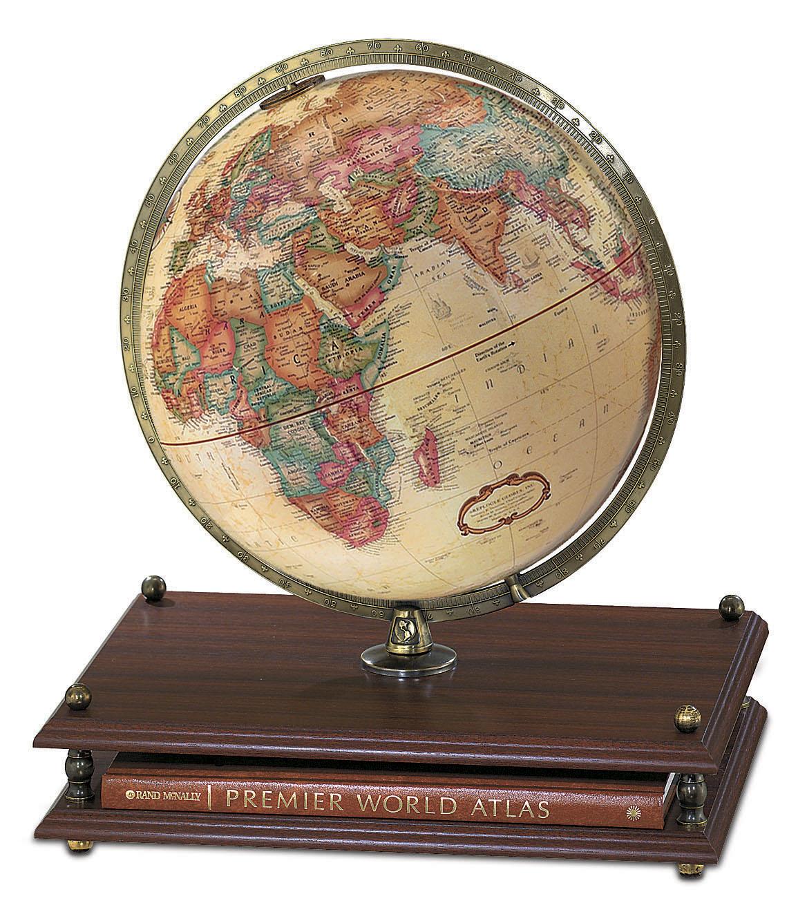 The best of both worlds. The stand is home for a hardbound Rand McNally World Atlas, and the 12" antique-ocean globe rests in a calibrated brass-plated full-meridian. The cherry-finish base enhances the Premier's rich appearance.