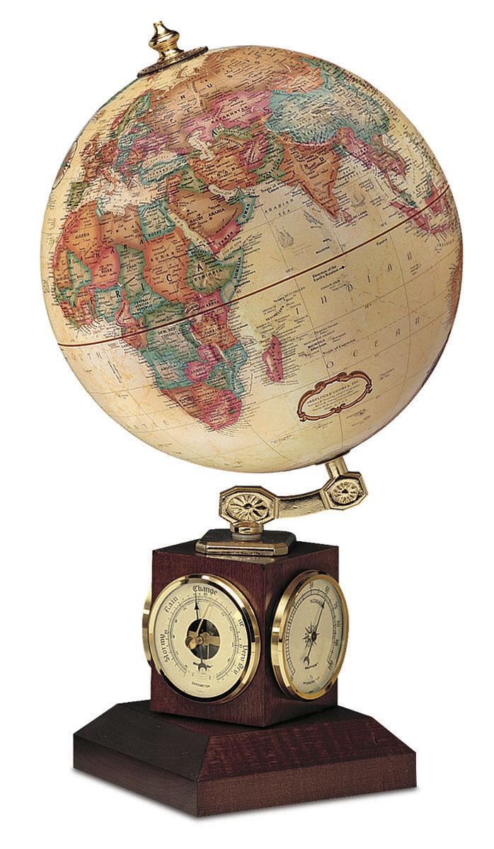 | Highly functional, endlessly fascinating. Three precision weather instruments — thermometer, barometer, and hygrometer — lend beautiful utility to the wooden cube base of the 9" Weather Watch. Brass-plated inclination mounting and finial accent complete this unique globe. |