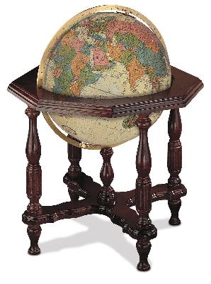| The antique-ocean Statesman features a hand-applied, hand-cut map. This 20" diameter illuminated globe is mounted on a striking hardwood base. Classic design details, solid brass engraved meridian, and light control make this a bold addition to any environment. |