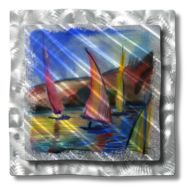 | Artist: Ash Carl Designs Year: 2010 Layers: 2 Layers of Metal - 1 Back and 1 Front Capture the experience of sailing under the sun on the open sea with this Sunset Sailboats metal wall hanging. The artist gives a mixed media technique with varied hues of blue, green, orange, red, yellow, silver, and black for this artwork. Consisting of two metal layers with a swirling hand-sanded finish that offers an astonishing three dimensional effect. Adding this piece to any room will instantly liven your decor. Certificate of Authenticity Included. |