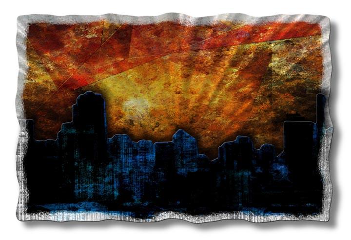| Artist: Ash Carl Designs Year: 2010 Layers: 2 Layers of Metal - 1 Back and 1 Front Add a metalic vibrant glow to your walls with this decorative Sunrise in the City metal wall sculpture. This beautiful illuminated metal wall hanging consists of 2 colorful painted metal layers comprised of 2 metal panels that will liven up any homes decor. Each metal artwork has an individually hand sanded design that will display a colorful three dimensional effect bringing the walls of any home to life. Certificate of Authenticity Included. |