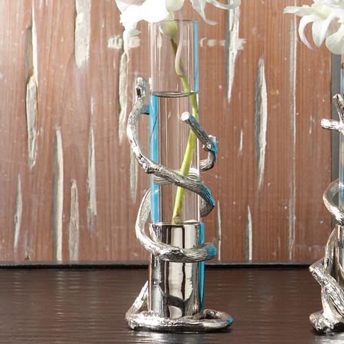 | Glass flower bud vase entwined with silver branches. |