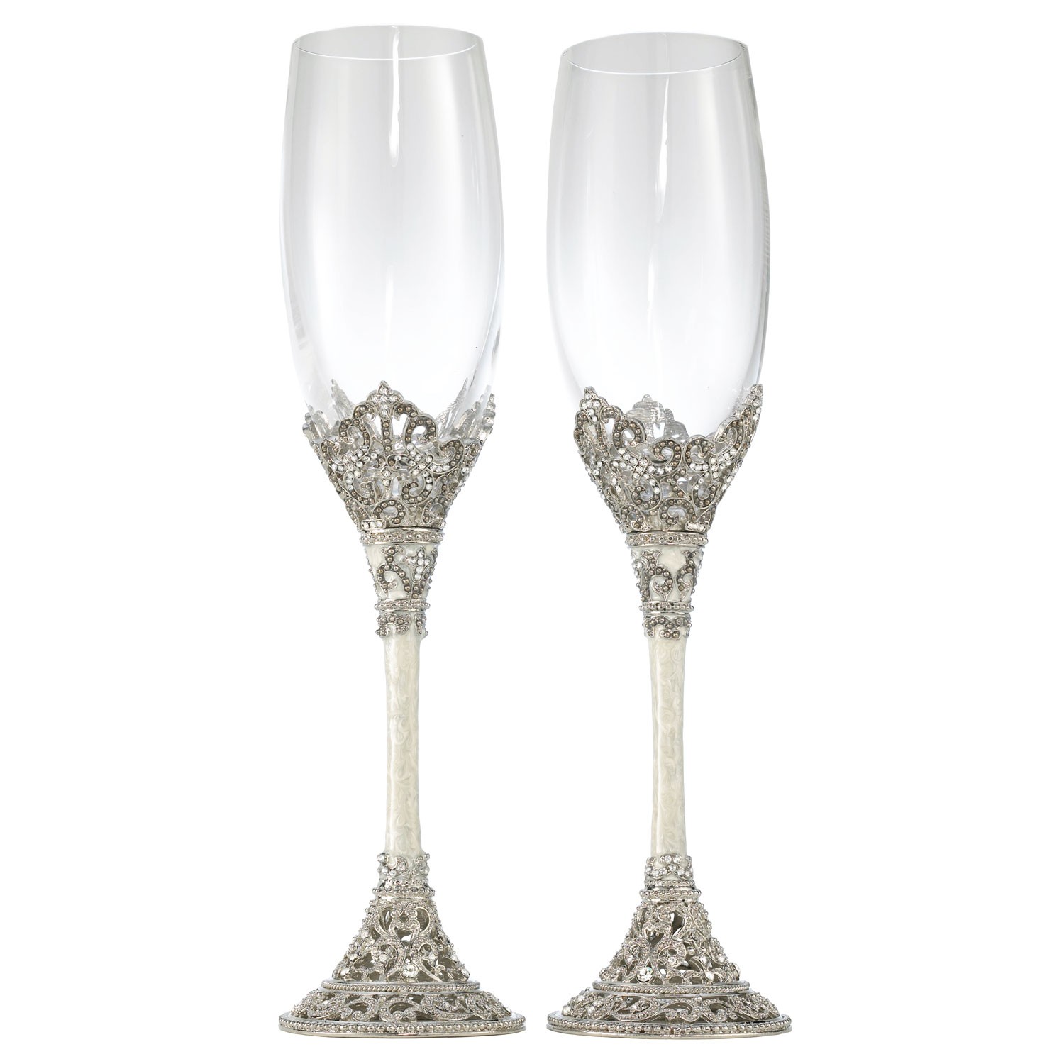 | Silver-tone filigree finish flute pair with white hand-enameling & hand-set clear Swarovski® crystals. Each flute holds 8 ounces. Exclusive designs, created with a touch of elegance by Olivia Riegel. |