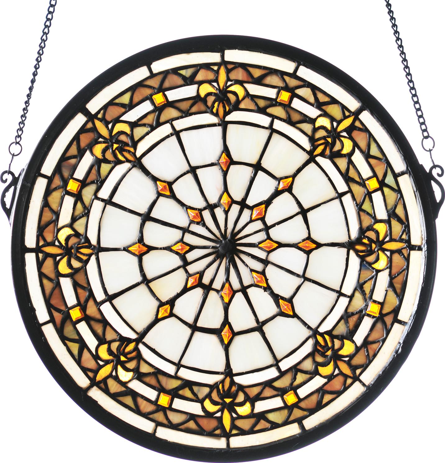 A Meyda Tiffany Original Design, The Fleur-De-Lis Medallion Window Is An Intricate Design Of Golden Tri-Petaled Irises And Jewels Against Twilight And Beige Bands. Reminiscent Of Castle And Cathedral Windows, This Pattern Holds A Prominent Place In French Heraldry. Handcrafted Utilizing The Copperfoil Construction Process And 296 Pieces Of Stained Art Glass And 24 Amber Glass Jewels Encased In A Solid Brass Frame. Mounting Bracket And Jack Chain Are Included.