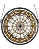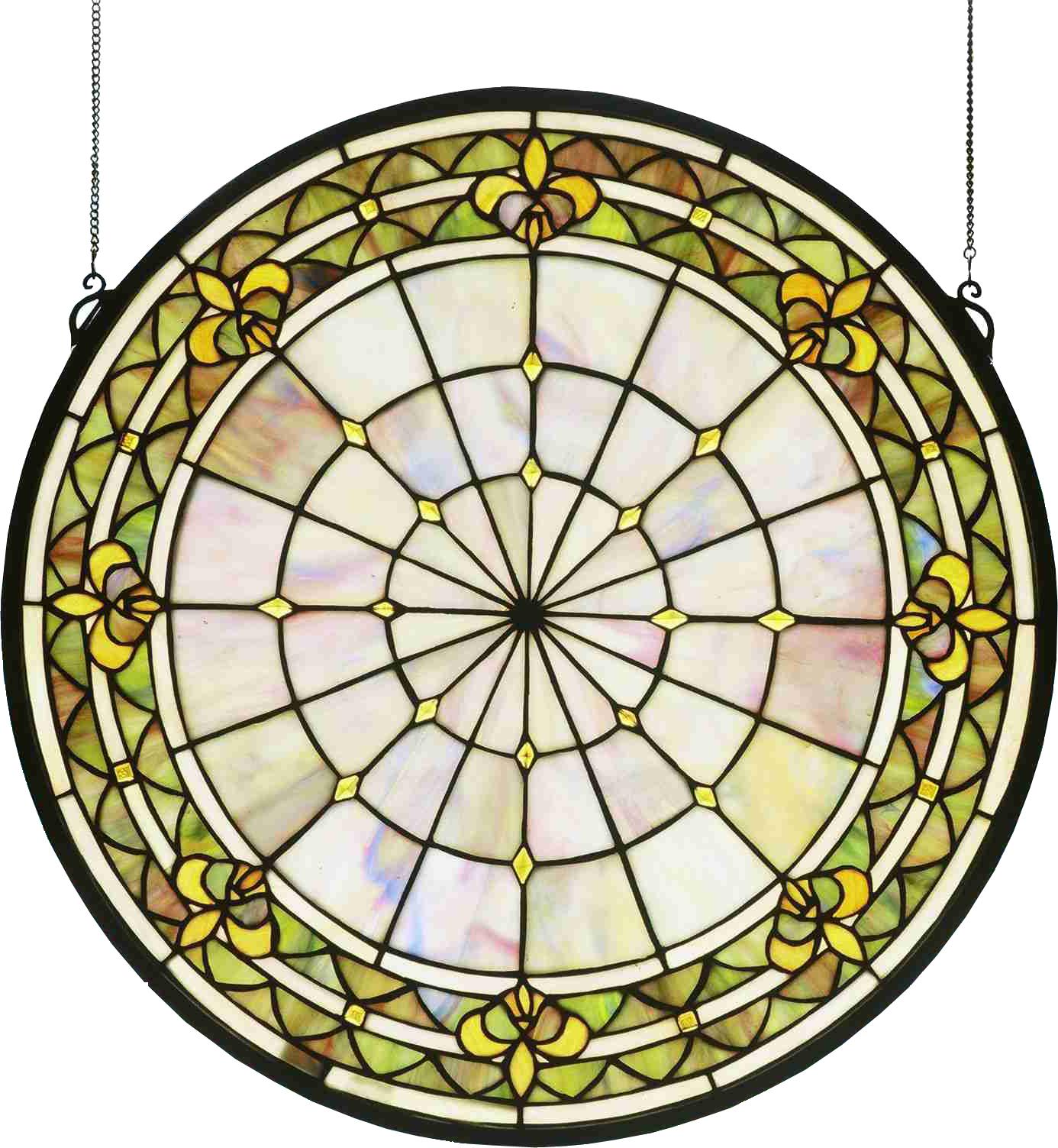 | A Meyda Tiffany Original Design, The Fleur-De-Lis Medallion Window Is An Intricate Design Of Golden Tri-Petaled Irises And Jewels Against Twilight And Beige Bands. Reminiscent Of Castle And Cathedral Windows, This Pattern Holds A Prominent Place In French Heraldry. Handcrafted Utilizing The Copperfoil Construction Process And 296 Pieces Of Stained Art Glass And 24 Amber Glass Jewels Encased In A Solid Brass Frame. Mounting Bracket And Jack Chain Are Included. Height: 21 |