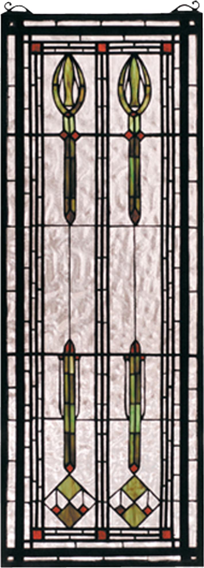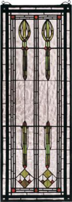 This American Style, Arts And Crafts Inspired Window, With Aurora Green Spears And Wood Brown Accents On Clear Flemish Textured Glass Has A Handsome Turn Of The Century Appeal. 320 Pieces Of Hand Cut Stained Glass Are Used To Make This Meyda Tiffany Window. A Solid Brass Hanging Chain And Brackets Are Included.